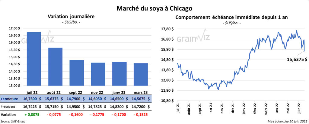 Les contrats de soya US aux échéances les plus rapprochées ont terminé la session en baisse entre 7 ¾ et 16 cents. Celui juillet 22 a fait exception en clôturant en hausse de ¾ cent. Les contrats de tourteau de soya US aux échéances les plus rapprochées ont fini la journée en progression entre 2,50 et 6,70 $/tonne. Les contrats d’huile de soya US aux échéances les plus rapprochées ont fait l’inverse en fermant avec des pertes entre 249 et 267 points.