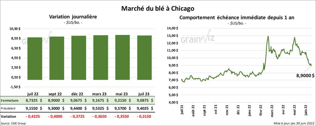 À Chicago, les contrats de blé aux échéances les plus rapprochées ont terminé la séance en baisse entre 37 ¼ et 42 ¼ cents. À Kansas, ceux de blé dur rouge aux échéances les plus rapprochées ont clôturé avec des pertes entre 36 ½ et 39 ½ cents. À Minneapolis, les contrats de blé de printemps aux échéances les plus rapprochées ont fini la session en recul entre 16 ½ et 35 ½ cents.