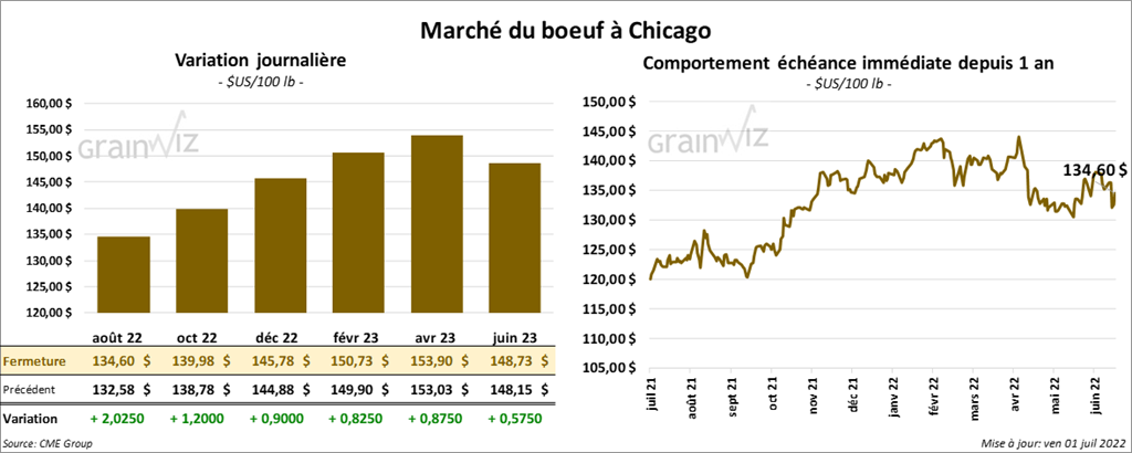 - Le 30 juin dernier, le CME Feeder Cattle Index était en baisse de 77 cents à 165,67 $.