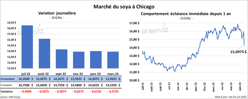 Les contrats de soya US aux échéances les plus rapprochées ont clôturé avec des pertes entre 49 et 58 ¾ cents. Ceux de tourteau de soya US aux échéances les plus rapprochées ont également fini dans le rouge entre 8,20 et 14,60 $/tonne. Les contrats d’huile de soya US aux échéances les plus rapprochées ont terminé en baisse entre 258 et 425 points.