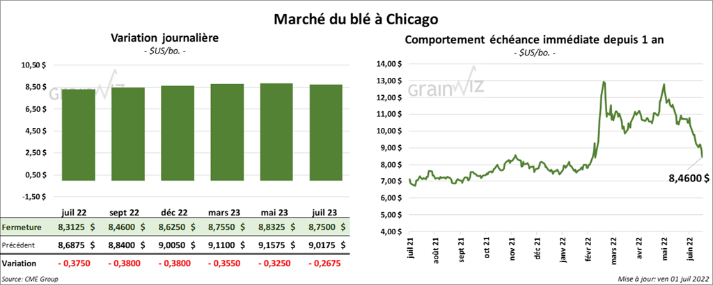 À Chicago, les contrats de blé aux échéances les plus rapprochées ont clôturé en recul entre 37 ½ et 38 cents. À Kansas, ceux de blé dur rouge aux échéances les plus rapprochées ont aussi terminé en baisse entre 37 ¾ et 39 ¼ cents. À Minneapolis, les contrats de blé de printemps ont fini avec des pertes entre 40 ¼ et 56 ¾ cents.
