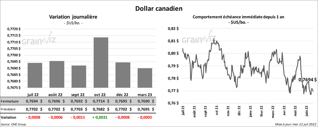 - Le rapport d’offre et de demande de juillet a été présenté ce midi. L’USDA a estimé la production de maïs US à 14,505 milliards de boisseaux, ce qui est une augmentation de 0,3 % comparativement à l’estimation de juin 2022/23. Les attentes des analystes étaient de 14,452 milliards de boisseaux. La production finale de 2021/22 est comptabilisée à 15,115 milliards de boisseaux. Les rendements ont été estimés à 177,0 boisseaux/acre, ce qui est inchangé par rapport à juin 2022/23 et inchangé comparativement à juin 2021/22. Du côté des inventaires de fin d’année de maïs US, l’USDA estime qu’ils sont de 1,470 milliard de boisseaux, soit en hausse par rapport aux 1,400 milliard de boisseaux de juin 2022/23.