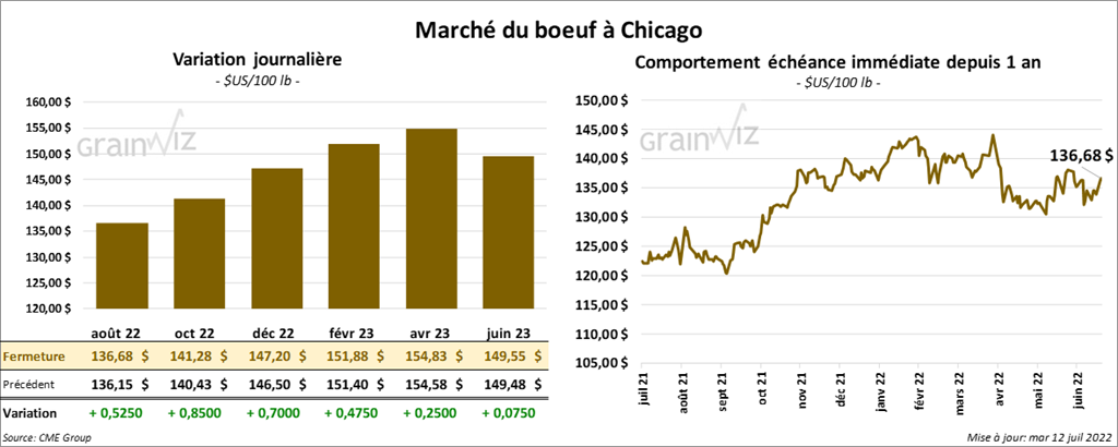 - Le 11 juillet dernier, le CME Feeder Cattle Index était en baisse de 87 cents à 171,34 $.