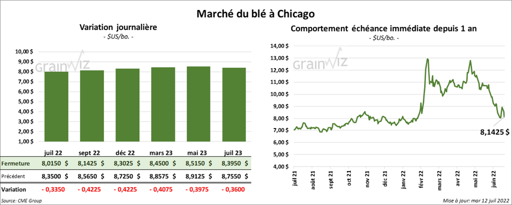À Chicago, les contrats de blé aux échéances les plus rapprochées ont fermé avec des pertes entre 33 ½ et 42 ¼ cents. À Kansas, ceux de blé dur rouge aux échéances les plus rapprochées ont terminé en recul de 47 ½ cents. À Minneapolis, les contrats de blé de printemps aux échéances les plus rapprochées ont clôturé en baisse entre 45 et 48 ½ cents.