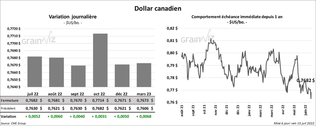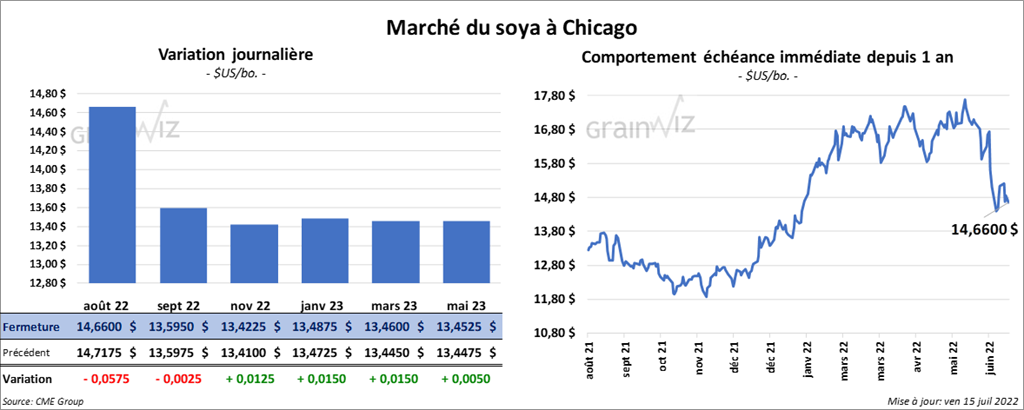 Les contrats de soya US aux échéances les plus rapprochées ont clôturé en recul entre ¼ et 5 ¾ cents. Celui novembre 22 a fait exception en finissant en hausse de 1 ¼ cent. Les contrats de tourteau de soya US aux échéances les plus rapprochées ont fermé en baisse entre 7,90 et 10,30 $/tonne. Les contrats de tourteau de soya US aux échéances les plus rapprochées ont fait l’inverse en terminant en hausse entre 194 et 233 points.