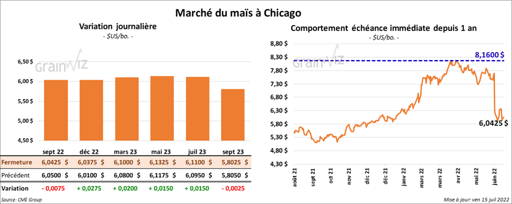 Les contrats de maïs US aux échéances les plus rapprochées ont terminé la journée avec des gains entre 2 et 2 ¾ cents. Celui septembre 22 a fait exception en fermant en baisse de ¾ cent.