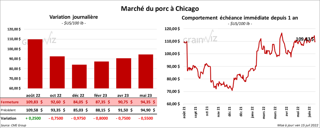 Les contrats de porc US aux échéances les plus rapprochées ont clôturé avec des pertes entre 75 et 97 cents. Celui août 22 a fait exception en terminant en progression de 25 cents.