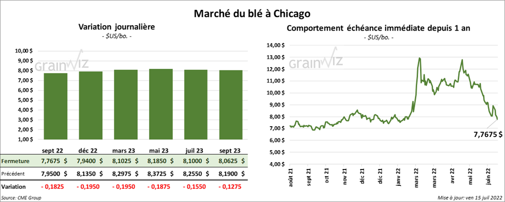 À Chicago, les contrats de blé aux échéances les plus rapprochées ont fermé en baisse entre 18 ¼ et 19 ½ cents. À Kansas, les contrats de blé dur rouge aux échéances les plus rapprochées ont également fini dans le rouge entre 10 ½ et 11 ½ cents. À Minneapolis, ceux de blé de printemps aux échéances les plus rapprochées ont terminé entre le neutre et une baisse de 3 ¾ cents.