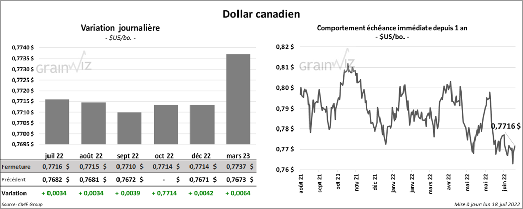 - Concernant les inspections à l’exportation de la semaine du 14 juillet dernier, celles de blé US ont été de 185,989 tonnes, soit à une baisse notable comparativement à la semaine précédente et à une réduction notable par rapport à l’an dernier. Le cumulatif annuel des inspections à l’exportation de blé US était inférieur à celui de l’an passé par 26,5 % à 2,108,759 tonnes.