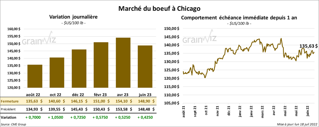 - Le 15 juillet dernier, le CME Feeder Cattle Index était en progression de 5 cents à 172,67 $.