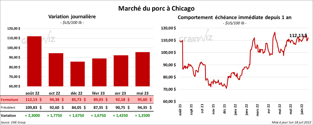 - Le 14 juillet dernier, le CME Lean Hog Index était en hausse de 76 cents à 114,15 $.