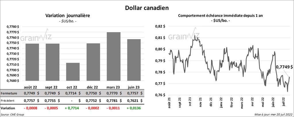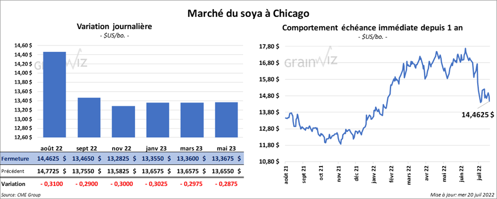 Les contrats de soya US aux échéances les plus rapprochées ont clôturé avec des pertes entre 29 et 30 cents. Les contrats de tourteau de soya US aux échéances les plus rapprochées ont fait l’inverse en finissant la session en hausse entre 20 cents et 1,50 $/tonne. Celui d’octobre 22 a fait exception en fermant en baisse de 50 cents/tonne. Ceux d’huile de soya US aux échéances les plus rapprochées ont terminé en recul entre 186 et 196 points.