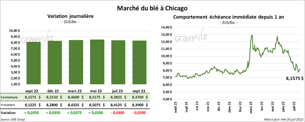 À Chicago, les contrats de blé aux échéances les plus rapprochées ont fermé en progression entre 2 ¾ et 3 ½ cents. À Kansas, ceux de blé dur rouge aux échéances les plus rapprochées ont également clôturé avec des gains entre 10 et 1 ¼ cents. À Minneapolis, les contrats de blé de printemps aux échéances les plus rapprochées ont fini en baisse entre 1 ½ et 2 ¼ cents. Celui septembre 22 a fait exception en terminant en hausse de 10 cents.