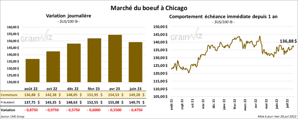 - Le 25 juillet dernier, le CME Feeder Cattle Index était en hausse de 89 cents à 169,91 $.