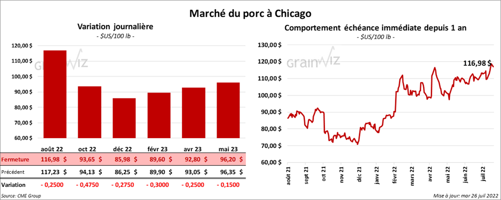 - Le 22 juillet dernier, le CME Lean Hog Index était en hausse de 91 cents à 119,13 $.