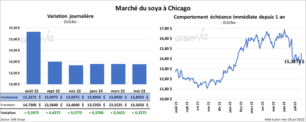 Les contrats de soya US aux échéances les plus rapprochées ont clôturé avec des gains entre 37 ¾ et 59 ¾ cents. Ceux de tourteau de soya US aux échéances les plus rapprochées ont également terminé en hausse entre 19 et 24,90 $/tonne. Les contrats d’huile de soya US aux échéances les plus rapprochées ont fini en progression entre 41 et 47 points.