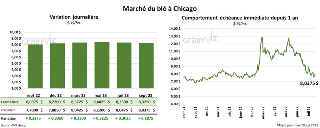 À Chicago, les contrats de blé aux échéances les plus rapprochées ont fermé en hausse entre 33 et 33 ¾ cents. À Kansas, ceux de blé dur rouge aux échéances les plus rapprochées ont fini la journée en progression entre 37 ¼ et 37 ½ cents. À Minneapolis, les contrats de blé de printemps aux échéances les plus rapprochées ont également terminé avec des gains entre 41 ¼ et 44 ¾ cents.