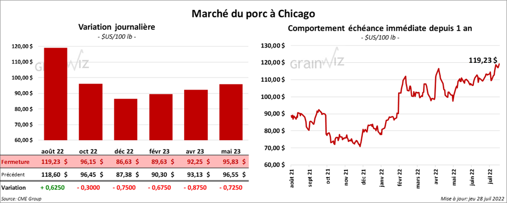 - Le 27 juillet dernier, le CME Lean Hog Index était en hausse de 85 cents à 120,58 $.