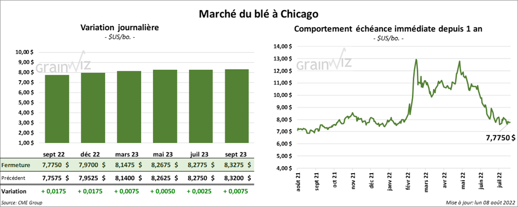 À Chicago, les contrats de blé aux échéances les plus rapprochées ont terminé la session en hausse entre ¾ et 1 ¾ cent. À Kansas, ceux de blé dur rouge aux échéances les plus rapprochées ont clôturé en progression entre ½ et ¾ cent. À Minneapolis, les contrats de blé de printemps aux échéances les plus rapprochées ont fait l’inverse en fermant en recul entre 2 ¾ et 6 cents.