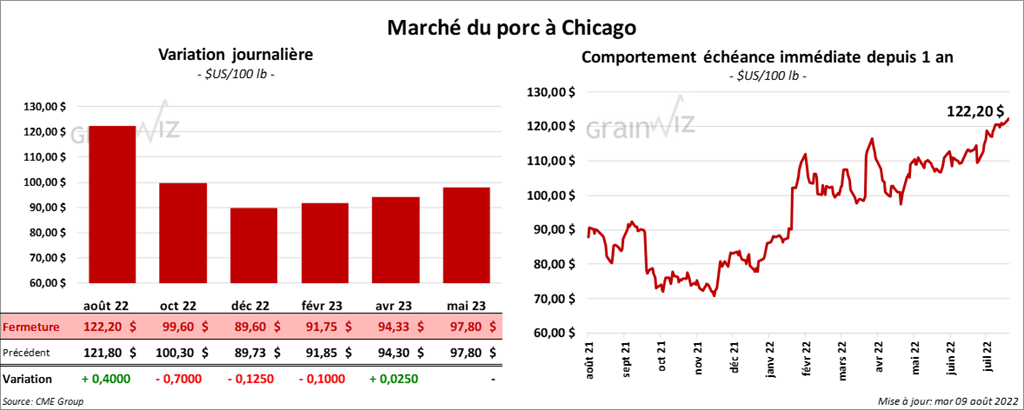 - Le 5 août dernier, le CME Lean Hog Index était en baisse de 17 cents à 121,92 $.