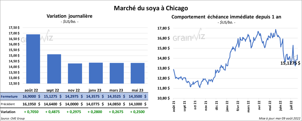 Les contrats de soya US aux échéances les plus rapprochées ont clôturé avec des gains entre 29 ¾ et 70 ½ cents. Ceux de tourteau de soya US aux échéances les plus rapprochées ont également fini en progression entre 12,80 et 17,30 $/tonne. Les contrats d’huile de soya US aux échéances les plus rapprochées ont terminé la séance en hausse entre 41 et 49 points.