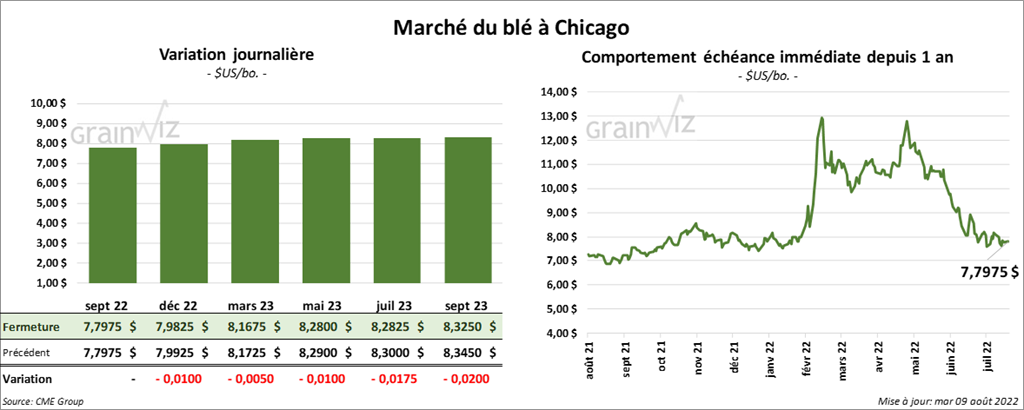 À Chicago, les contrats de blé aux échéances les plus rapprochées ont fermé en baisse entre ½ et 1 cent. Celui septembre 22 a fait exception en terminant au neutre. À Kansas, les contrats de blé dur rouge ont clôturé en hausse entre 2 ¾ et 4 cents. À Minneapolis, ceux de blé de printemps aux échéances les plus rapprochées ont clôturé avec des gains entre 11 et 12 cents.