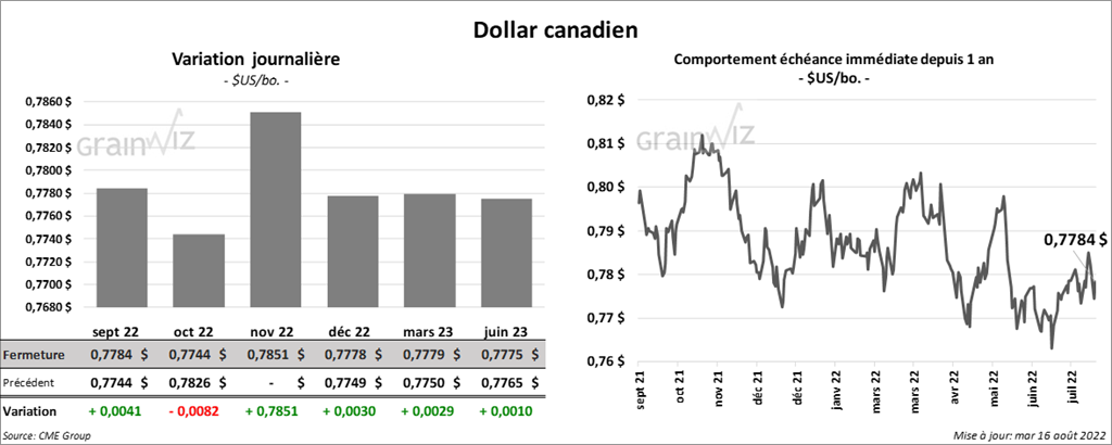 - SovEcon a augmenté son estimation de la récolte de blé russe de 3,8 millions de tonnes à 94,9 millions de tonnes. Les rendements du blé d’hiver ont été un record. Elle note aussi que les conditions pour le blé de printemps russe se sont améliorées. Cependant, la firme russe estime que les exportations de blé russe 2022/23 pourraient être lentes. De son côté, l’USDA estime la production de blé russe 2022/23 en hausse de 81,5 à 88 millions de tonnes, mais l’organisme s’attend plutôt à des exportations de blé russe à 42 millions de tonnes, une hausse de 2 millions de tonnes par rapport à juillet dernier.