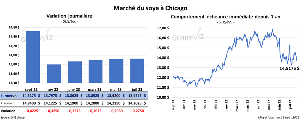 Les contrats de soya US aux échéances les plus rapprochées ont terminé la séance en baisse entre 32 ½ et 42 ¼ cents. Ceux de tourteau de soya US ont également fini dans le rouge entre 9,00 et 16,30 $/tonne. Les contrats d’huile de soya US aux échéances les plus rapprochées ont fermé en recul entre 92 et 110 points.