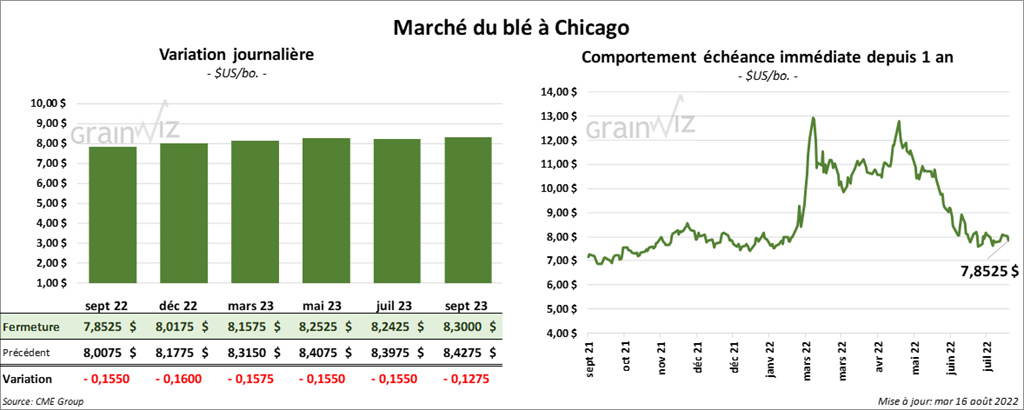 À Chicago, les contrats de blé US aux échéances les plus rapprochées ont fini la journée en baisse entre 15 ½ et 16 cents. À Kansas, ceux de blé dur rouge aux échéances les plus rapprochées ont clôturé en recul entre 11 et 12 ¾ cents. À Minneapolis, les contrats de blé de printemps aux échéances les plus rapprochées ont terminé avec des pertes entre 8 et 10 ½ cents.