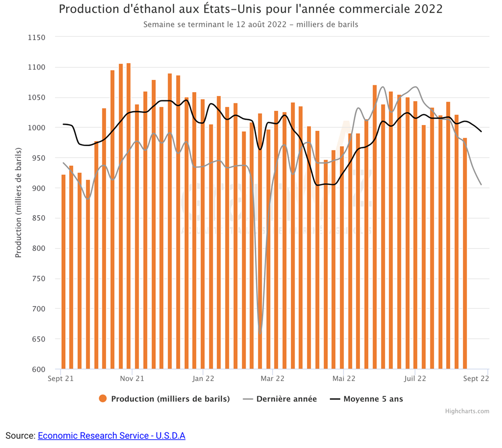 Hier, l’EIA présentait son rapport hebdomadaire sur l’éthanol US. Elle a estimé que durant la semaine du 12 août dernier, la production moyenne avait été de 983,000 barils par jour. La moyenne des attentes des analystes était plus élevée à 1,022 bpj. Il s’agissait en fait d‘une baisse de 3,8 % comparativement à la semaine précédente et d’une augmentation de 1 % par rapport à la même période l’an dernier. Au total, 6,881 millions de barils ont été produits au cours de la semaine. 99,8 millions de boisseaux de maïs ont été utilisés dans la fabrication de l’éthanol US.