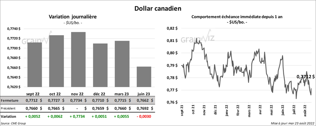 - En Ukraine, l’Ukrainian Grain Association estime que les Ukrainiens vont probablement récolter 24 millions de tonnes de maïs cette année, soit une baisse de 12 % par rapport à sa dernière prévision. De son côté, UkrAgroConsult estime que les Ukrainiens vont récolter 26,5 millions de tonnes de maïs, ce qui correspond à une augmentation de 800,000 tonnes comparativement à sa dernière projection. L’an dernier, l’Ukraine avait récolté 42,1 millions de tonnes de maïs.