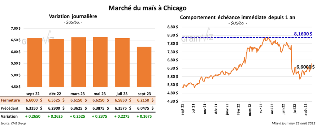 Les contrats de maïs US aux échéances les plus rapprochées ont clôturé avec des gains entre 25 ¼ et 26 ½ cents.