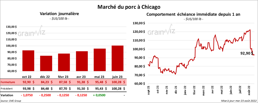 - Le 19 août dernier, le CME Lean Hog Index était en recul de 31 cents à 119,98 $.