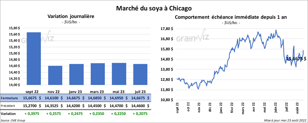 Les contrats de soya US aux échéances les plus rapprochées ont terminé la journée en progression entre 24 ¾ et 39 ¾ cents. Ceux de tourteau de soya US aux échéances les plus rapprochées ont également fini en hausse entre 8,00 et 11,80 $/tonne. Les contrats d’huile de soya US aux échéances les plus rapprochées ont clôturé avec des gains entre 67 et 82 points.