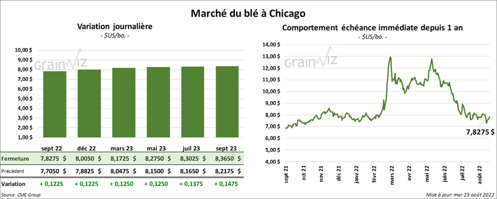 À Chicago, les contrats de blé aux échéances les plus rapprochées ont terminé la session en hausse entre 12 ¼ et 12 ½ cents. À Kansas, ceux de blé dur rouge aux échéances les plus rapprochées ont aussi fini en progression entre 12 ¼ et 17 ¼ cents. À Minneapolis, les contrats de blé de printemps ont fermé avec des gains de 11 ½ cents.