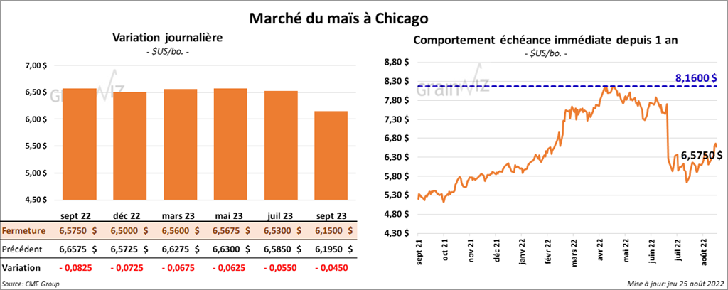 - Au cours de la semaine du 11 août dernier, les ventes à l’exportation de maïs US 2021/22 ont été de 99,300 tonnes, ce qui était une baisse de 48 % par rapport à la semaine précédente et une réduction de 8 % comparativement à la moyenne des 4 dernières semaines. La Chine et la Colombie ont été les principales acheteuses. Pour 2022/23, les ventes à l’exportation ont été de 750,000 tonnes. Les destinations inconnues et le Mexique ont été les plus gros acheteurs. Les anticipations des analystes étaient entre 475,000 et 1,0 million de tonnes.