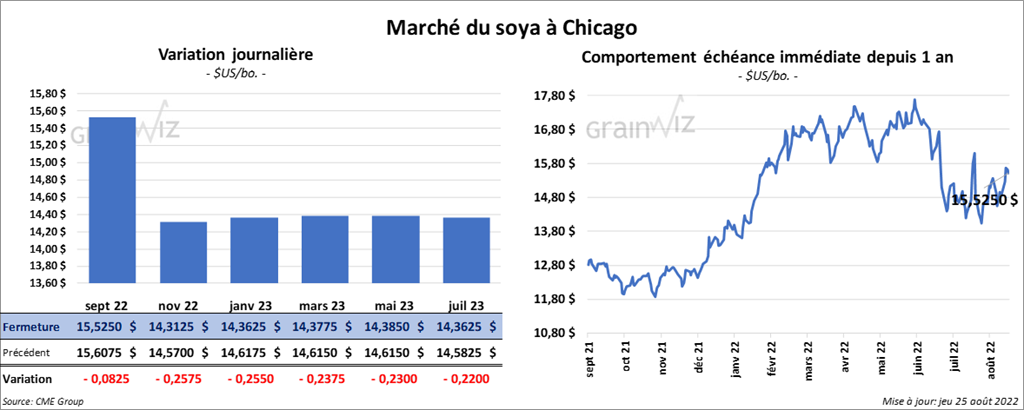Les contrats de soya US aux échéances les plus rapprochées ont clôturé avec des pertes entre 8 ¼ et 25 ¾ cents. Ceux de tourteau de soya US aux échéances les plus rapprochées ont également fermé dans le rouge entre 9,70 et 15,00 $/tonne. Les contrats d’huile de soya US aux échéances les plus rapprochées ont fini entre une hausse de 32 points et une baisse de 6 points.