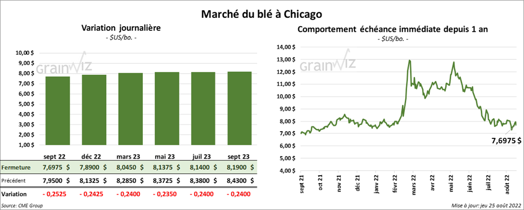 À Chicago, les contrats de blé aux échéances les plus rapprochées ont terminé la journée en recul entre 24 et 25 ¾ cents. À Kansas, ceux de blé dur rouge aux échéances les plus rapprochées ont fini en baisse entre 24 ½ et 27 ¼ cents. À Minneapolis, les contrats de blé de printemps aux échéances les plus rapprochées ont également clôturé avec des pertes entre 24 et 25 cents.