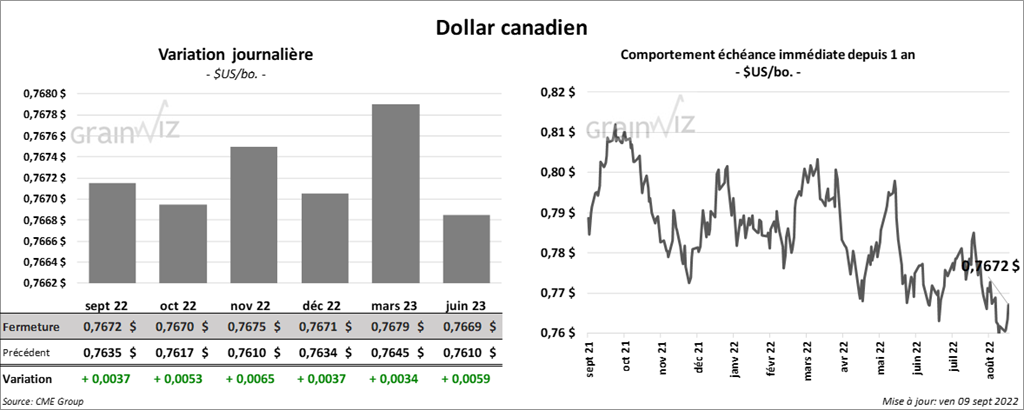 - Lundi prochain, l’USDA devrait présenter son rapport d’offre et de demande pour le mois de septembre. Dans le cas du maïs US, les analystes s’attendent à des rendements de 172,5 bo./acres, ce qui est une baisse comparativement aux 175,4 bo./acre d’août dernier et une réduction par rapport aux 177,0 bo./acre de l’an passé. Ils voient également les superficies récoltées à 81,686 millions d’acres, soit à des baisses comparativement aux 81,840 millions d’acres d’août et aux 81,840 millions d’acres de l’an passé. Quant à la production de maïs US, les analystes l’anticipent à 14,088 milliards de boisseaux, ce qui représente des réductions comparativement aux 14,359 milliards de boisseaux d’août dernier et aux 15,115 milliards de boisseaux de l’an dernier. Pour les stocks de fin d’année de maïs US, les analystes les projettent à 1,217 milliard de boisseaux comparativement aux 1,388 milliard de boisseaux d’août dernier.