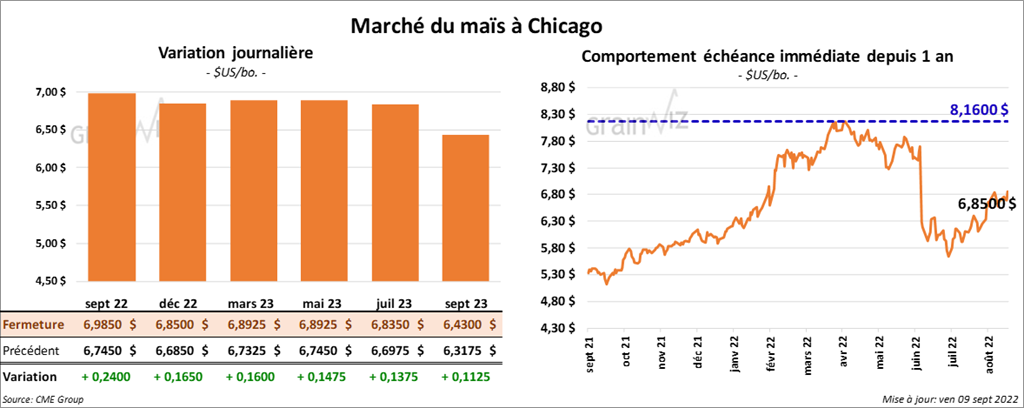 - FranceAgriMer estime qu’au 5 septembre dernier, les conditions de culture du maïs français ont baissé de 2 % à 43 % dans les catégories «bon excellent». L’an dernier, les conditions étaient à 89 % dans les mêmes catégories. La chaleur et la sécheresse des derniers mois ont gravement affecté les plants de maïs français.