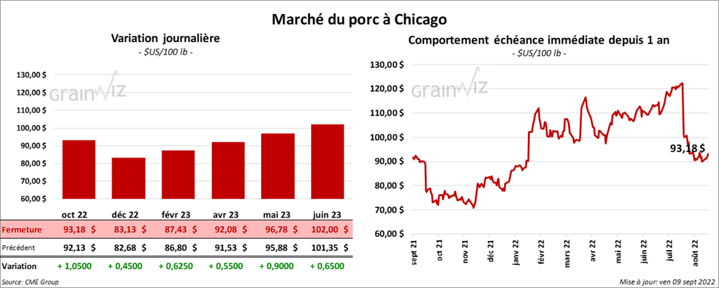 - Le 7 septembre dernier, le CME Lean Hog Index était en baisse de 1,22 $ à 100,26 $.