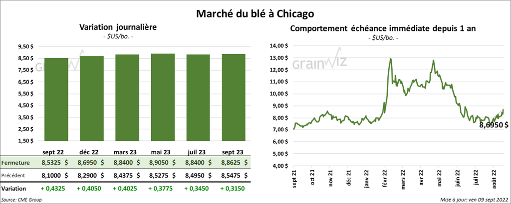 - CFTC : Le 6 septembre dernier, à Chicago, les spéculateurs avaient réduit leurs positions dans le blé de 11 % à 11,087 contrats. Le minimum des 52 dernières semaines était de 7,520 contrats et le maximum de 65,609 contrats. À Minneapolis, ils avaient fait l’inverse en augmentant leurs positions de 403 contrats à -1,038 contrats. Le minimum des 52 dernières semaines était de -1,464 contrats et le maximum de 19,867 contrats.