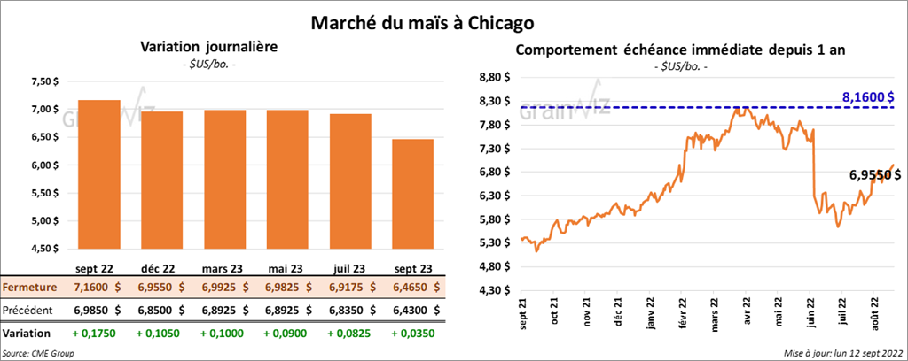- Durant la semaine du 8 septembre dernier, les inspections à l’exportation de maïs US ont été de 446,620 tonnes, soit à une baisse de 16 % comparativement à la semaine précédente, mais aussi à une augmentation notable par rapport à l’an dernier. Le cumulatif annuel des inspections à l’exportation était notablement supérieur à celui de l’an passé à 558,699 tonnes.