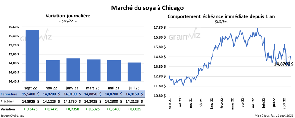 - Pour le rapport d’offre et de demande, l’USDA estime les rendements de soya US à 50,5 bo./acre, ce qui est moins élevé par rapport aux 51,9 bo./acre d’août dernier ou aux 51,4 bo./acre de l’an passé. Les analystes anticipaient aussi un résultat supérieur à 51,5 bo./acre. Quant aux superficies récoltées, l’USDA a estimé celles de soya US à 86,631 millions d’acres, soit à une baisse par rapport aux 87,211 millions d’acres d’août dernier, mais aussi à une hausse comparativement aux 86,322 millions d’acres de l’an passé. Les analystes s’attendaient à des superficies plus élevées à 87,288 millions d’acres. Pour la production, l’USDA l’estime à 4,378 milliards de boisseaux, ce qui est une baisse comparativement aux 4,531 milliards de boisseaux d’août dernier et aux 4,435 milliards de boisseaux de l’an passé. Les anticipations des analystes étaient aussi plus élevées à 4,496 milliards de boisseaux. Du côté des stocks de fin d’année, l’USDA a évalué ceux de soya US 2022/23 à 200 millions de boisseaux comparativement aux 245 millions de boisseaux d’août dernier et aux 240 millions de boisseaux de l’an passé. Les analystes s’attendaient aussi à un résultat plus élevé à 247 millions de boisseaux.