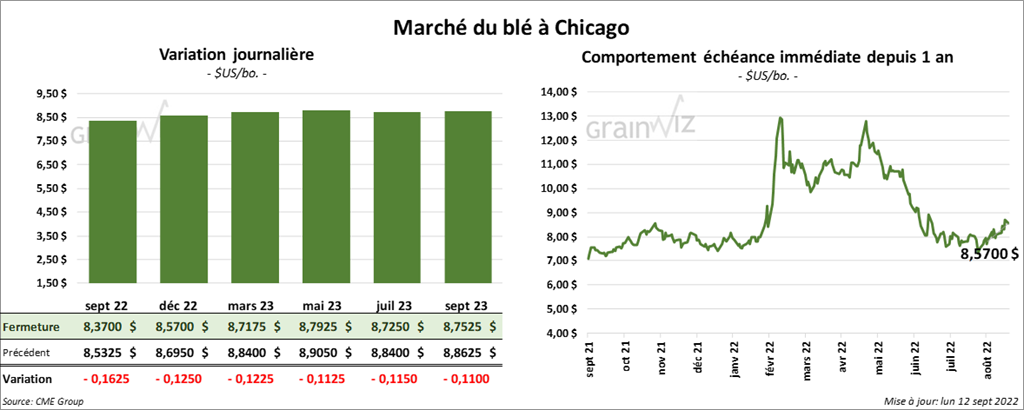 À Chicago, les contrats de blé aux échéances les plus rapprochées ont fini la séance en baisse entre 12 ¼ et 16 ¼ cents. À Kansas, les contrats de blé dur rouge aux échéances les plus rapprochées ont clôturé en recul entre 2 et 2 ¼ cents. Celui septembre 22 a fait exception en fermant en hausse de 8 cents. À Minneapolis, les contrats de blé de printemps aux échéances les plus rapprochées ont terminé avec des pertes entre 2 ¼ et 8 ¾ cents.