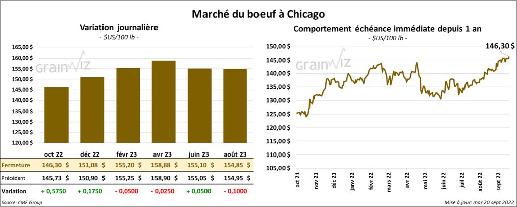 - Le 19 septembre dernier, le CME Feeder Cattle Index était en hausse de 28 cents à 178,20 $.