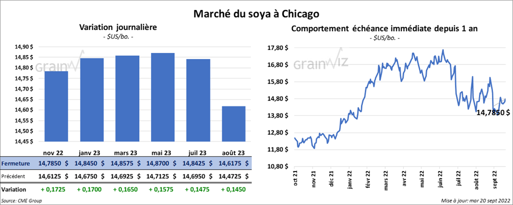 Les contrats de soya US aux échéances les plus rapprochées ont terminé la journée en progression entre 16 ½ et 17 ¼ cents. Ceux de tourteau de soya US aux échéances les plus rapprochées ont également fini dans le vert entre 9,50 et 12,60 $/tonne. Les contrats d’huile de soya US aux échéances les plus rapprochées ont clôturé en hausse entre 59 et 75 points.