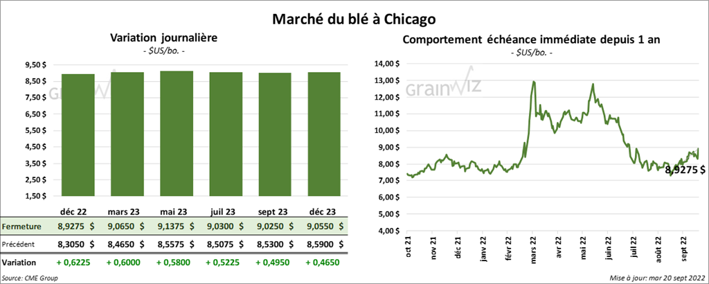 À Chicago, les contrats de blé aux échéances les plus rapprochées ont fini en hausse entre 58 et 62 ¼ cents. À Kansas, ceux de blé dur rouge aux échéances les plus rapprochées ont aussi fermé en progression entre 50 ¼ et 53 ¼ cents. À Minneapolis, les contrats de blé de printemps aux échéances les plus rapprochées ont clôturé avec des gains 24 ¾ et 32 ¾ cents.