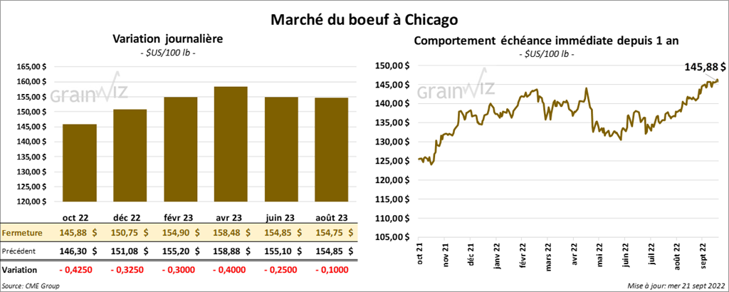 - Le 20 septembre dernier, le CME Feeder Cattle Index a été en baisse de 10 cents à 178,10 $.