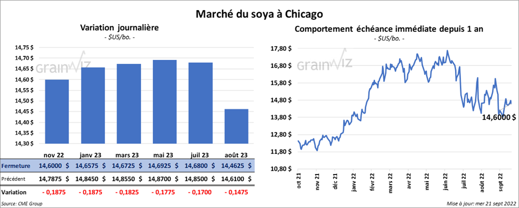 Les contrats de soya US aux échéances les plus rapprochées ont fermé en recul entre 18 ¼ et 18 ¾ cents. Ceux de tourteau de soya US aux échéances les plus rapprochées ont également terminé la journée dans le rouge entre 60 cents/tonne et 2,70 $/tonne. Celui octobre 22 a fait exception en finissant en hausse de 3,90 $/tonne. Les contrats d’huile de soya US aux échéances les plus rapprochées ont clôturé avec des pertes entre 76 et 91 points.